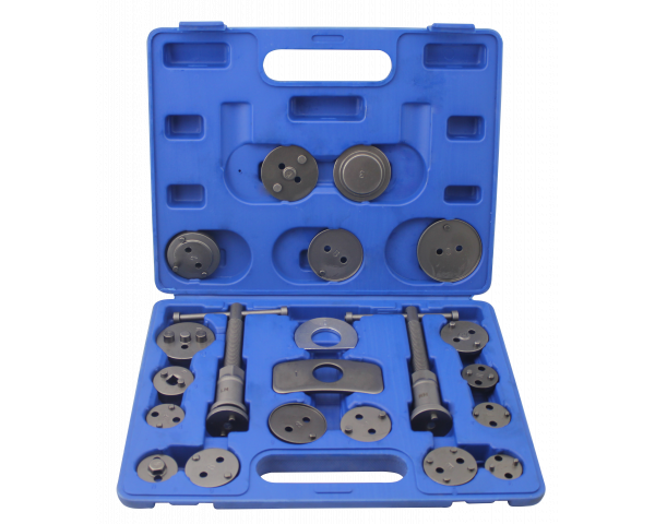 Инструмент сведения тормозных цилиндров 21шт - комплект универсальных приспособлений для утапливания поршней тормозных цилиндров с правосторонней и левосторонней резьбой. Данный набор подходит для обслуживания большинства легковых автомобилей.