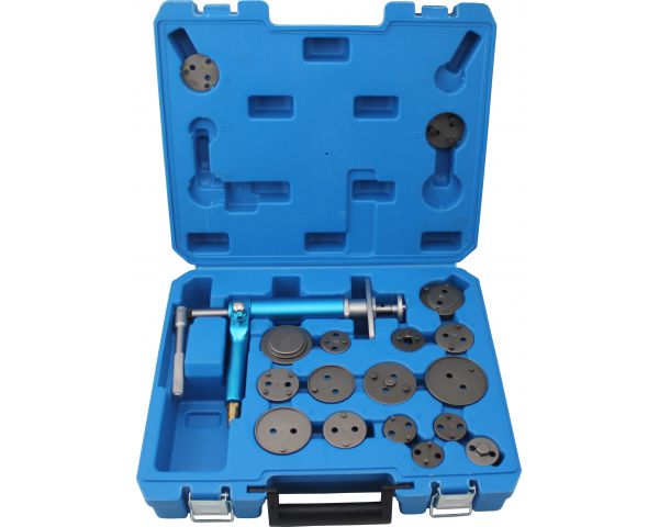 Набор для возврата тормозных поршней, исключающий риск повреждения поршней или резиновых манжет. Набор содержит основной инструмент с пневмоцилиндром для выталкивания шеек поршней. В комплект входят 17 адаптеров. Пригоден для суппортов как с левой, так и с правой резьбой.