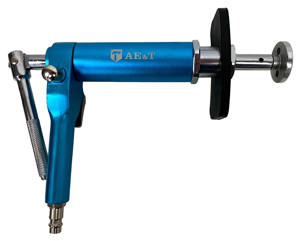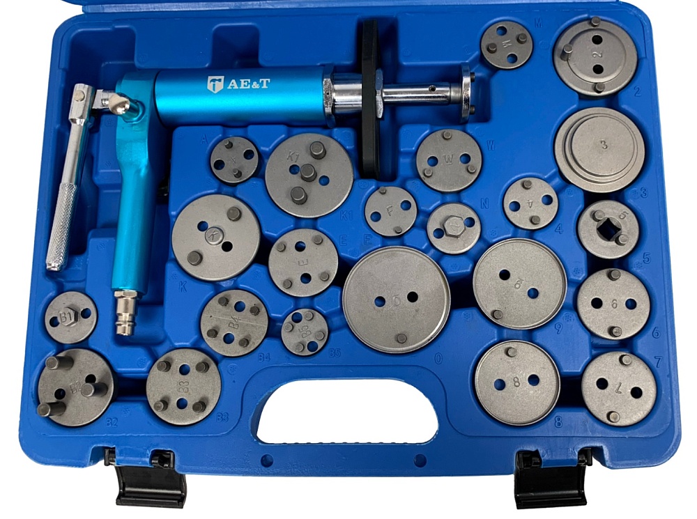 Набор для возврата тормозных поршней, исключающий риск повреждения поршней или резиновых манжет. Набор содержит основной инструмент с пневмоцилиндром для выталкивания шеек поршней. В комплект входят 20 адаптеров. Пригоден для суппортов как с левой, так и с правой резьбой.