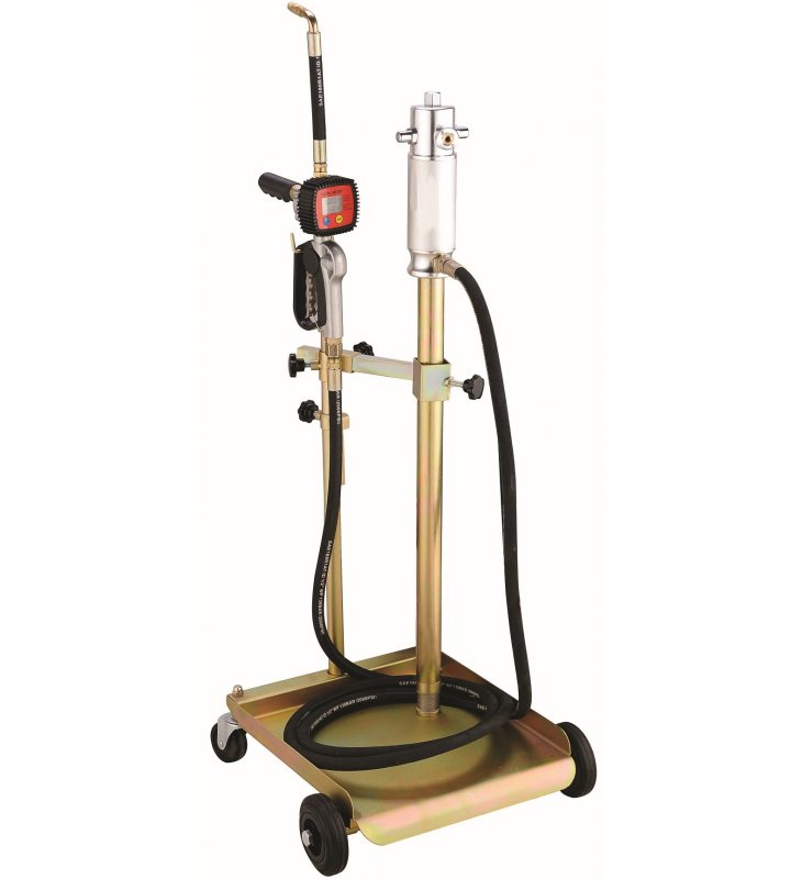Тележки для бочек 20-60 кг. Установка оснащена тележкой, пневматический насос для масла 3:1 производительность 18л/мин, шланг 4 м, раздаточный пистолет с электронным счетчиком.  Колёса 2 прямых + 2 поворотных. Масса: 25,5 кг.