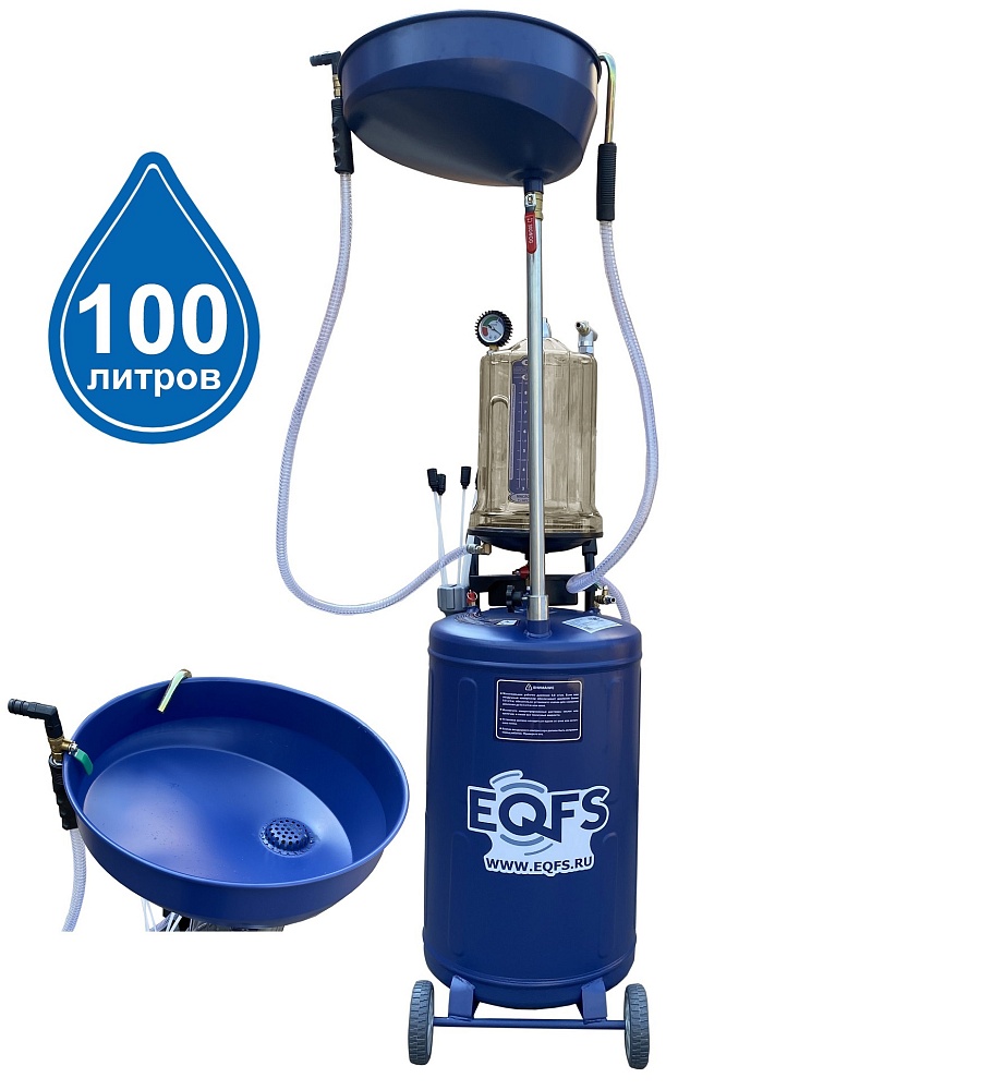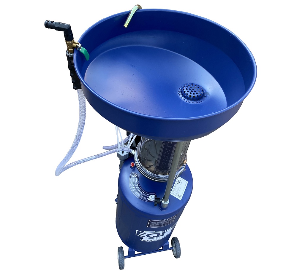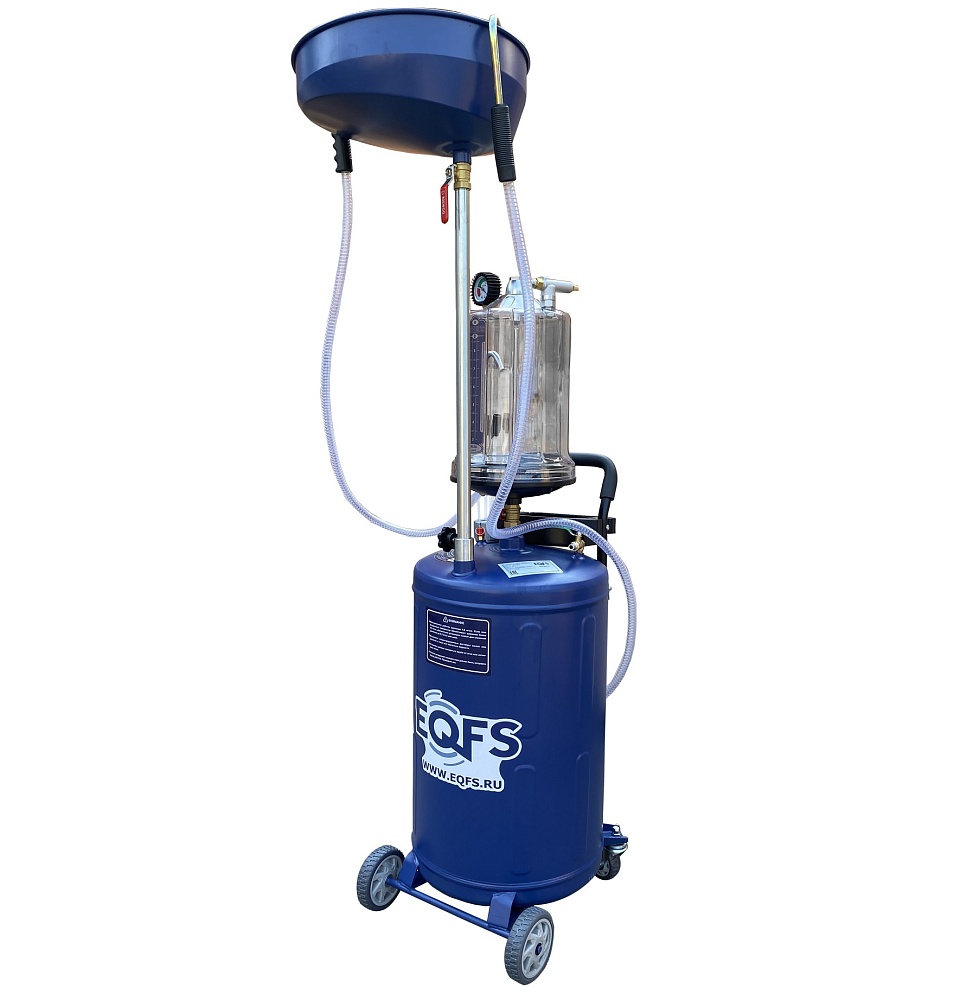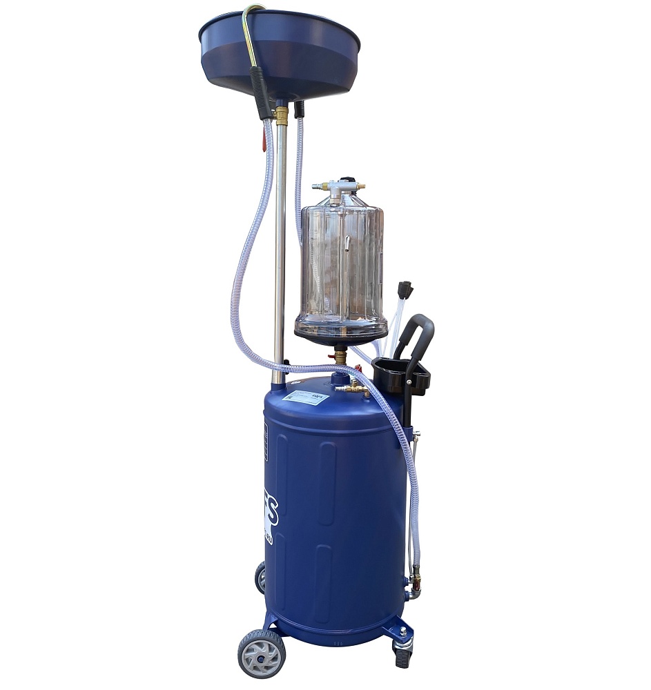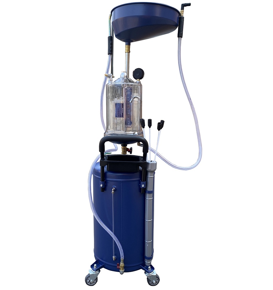 Установка для слива и откачки щупами масла и антифриза из ДВС, КПП и мостов. В комплекте: Колба с особо прочным пластиком + Сливная чаша с сеткой для улавливания мелких деталей + Щупы гибкие 5 шт. + Лоток для сливной пробки + Металлические пистолеты для откачки масла + визуальный контроль уровня отработки+ стрелочная индикация уровня разрежения в установке + Быстросъёмный штуцер для пневмолинии + Сепаратор для выхода воздуха. Вмещает 100 л. = Бак 80л + колба 10 л. + сливная воронка 10л.