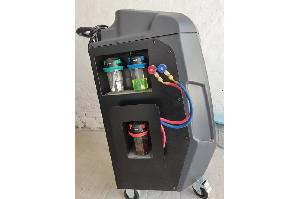 Автоматическая установка для обслуживания автомобильных систем кондиционирования с фреоном R-134a. Функции: откачивание и очистка хладагента из системы, отделение и последующий сброс масла, вакуумирование системы, автоматическая заправка фреона и масла.