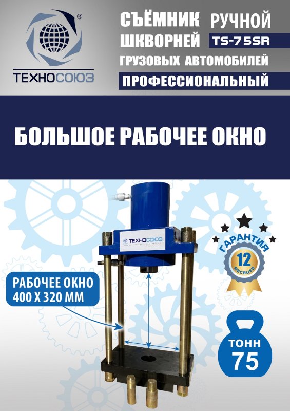 Усилие 75 тонн, ручной насос, ход поршня 160 мм, диаметр шкворня до 60 мм. Рабочее окно 400×320 мм, мобильный на колесах для выездных работ.