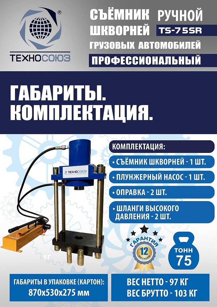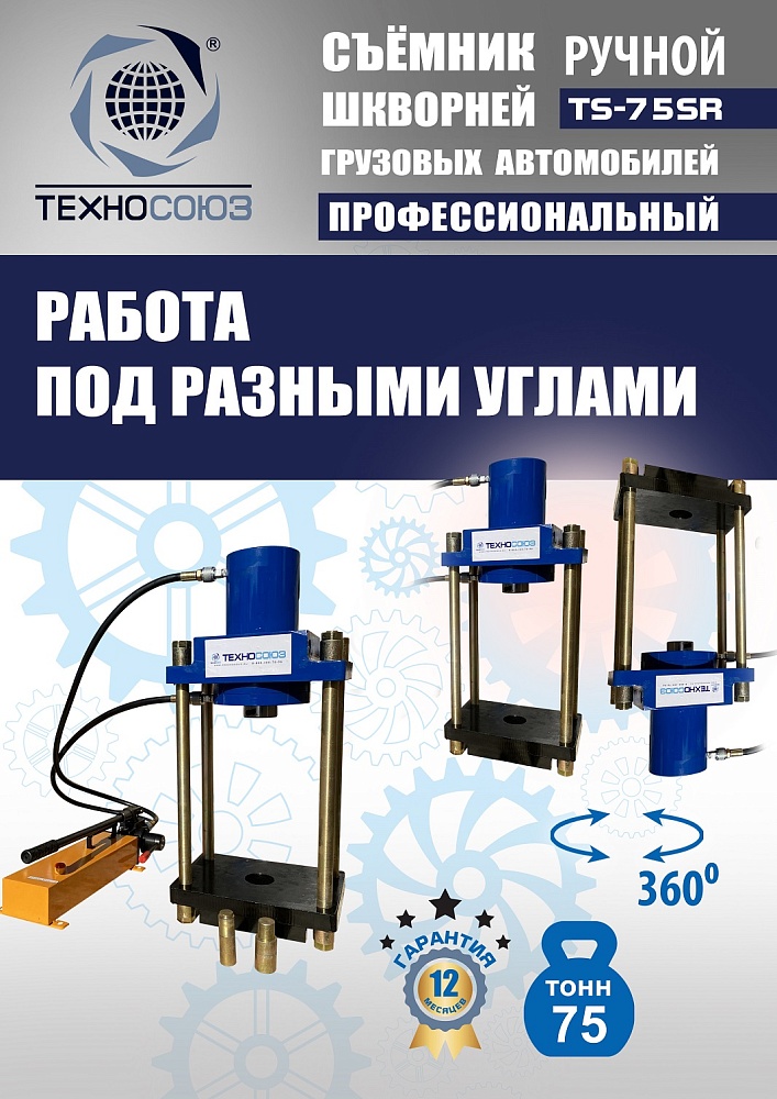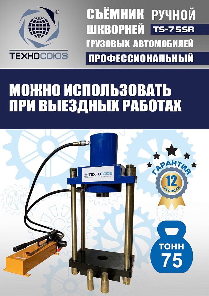 Компактный гидравлический съемник шкворней TS-75SR для грузовиков (MAN, Mercedes, Scania, Volvo, КамАЗ, корейские/китайские), тракторов, погрузчиков, спецтехники — усилие 75 тонн, ручной насос, ход поршня 160 мм, диаметр шкворня до 60 мм. Рабочее окно 400×320 мм, мобильный на колесах для выездных работ.